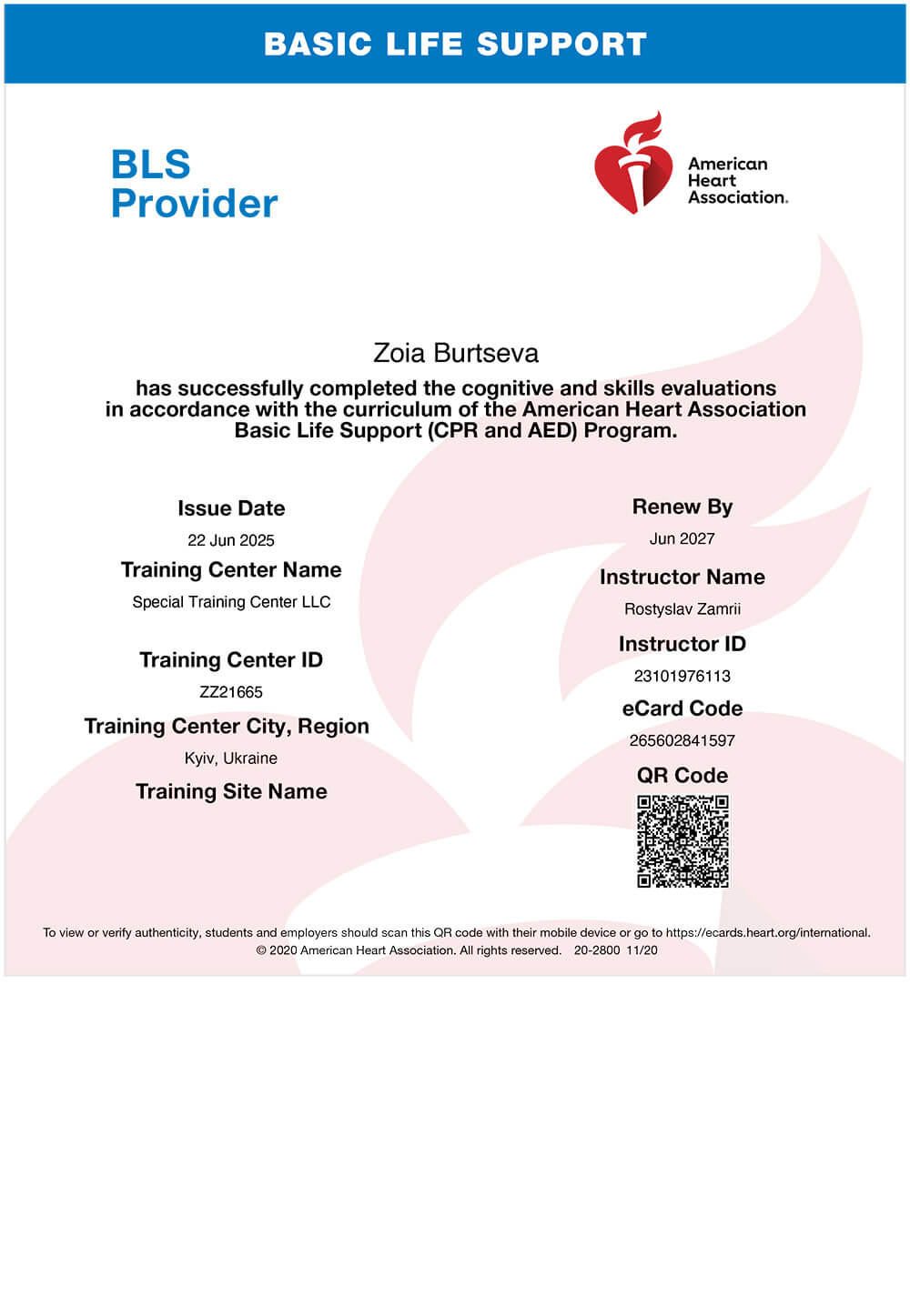 - BLS Provider — Basic Life Support (CPR and AED) Program, American Heart Association
